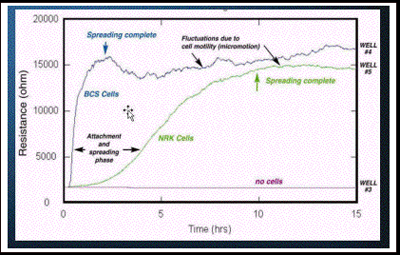 ECIS技術的重要應用之一是研究細胞伸展貼壁行為。這種測量方法可以研究細胞與細胞外基質的相互作用對細胞貼壁能力的作用。這種方法是實時的和定量地,和傳統的終點法相比有著顯著的優勢。