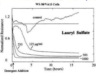 上圖是十二烷基磺酸鈉對WI-38細胞的作用,可以看出這種化合物對細胞的生長有著明顯的抑制作用,并且濃度越高抑制效果越顯著。