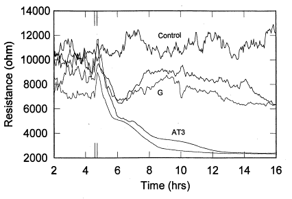 典型的損傷修復實驗如下圖所示。BSC1細胞首先長成單細胞層,然后兩個孔中給予點擊,使測量電極上的細胞死亡,引起阻抗值降低。隨時間的延長這兩個曲線又回到初始數值,這是由于那些在電極外的正常細胞向損傷地區遷移并重新生長并且替換已死去細胞。