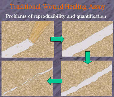 傳統的細胞損傷修復實驗一般使用生長增殖快的單細胞層,然后在細胞層上劃一條線,小面積的細胞層被損傷。當周圍細胞進入并且生長填滿被損壞的區域時(修復),可以用顯微鏡檢查到損壞的區域里的細胞狀況。